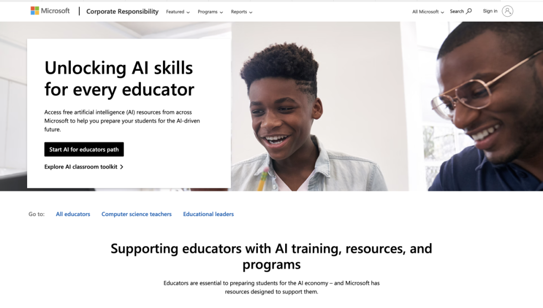 反不雅美国,的脚色次要是搭策框架、供给资金支撑取搭建激励平台,一方面,美国教师AI培训更多由企业、高校取平台配合供给图片来历于谷歌、微软官网截图